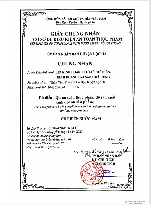 HỘ KINH DOANH, CƠ SỞ CHẾ BIẾN, KINH DOANH HẢI SẢN HÒA CUNG