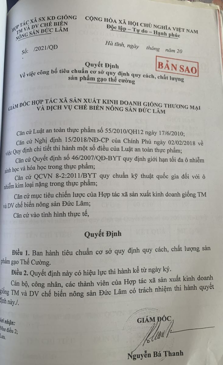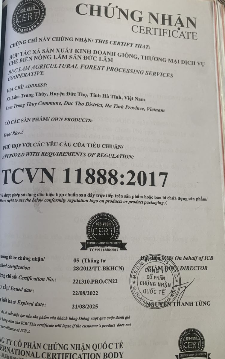Tên đơn vị/nhà sản xuất: HTX Sản xuất kinh doanh giống, thương mại dịch vụ chế biến nông lâm sản Đức Lâm
