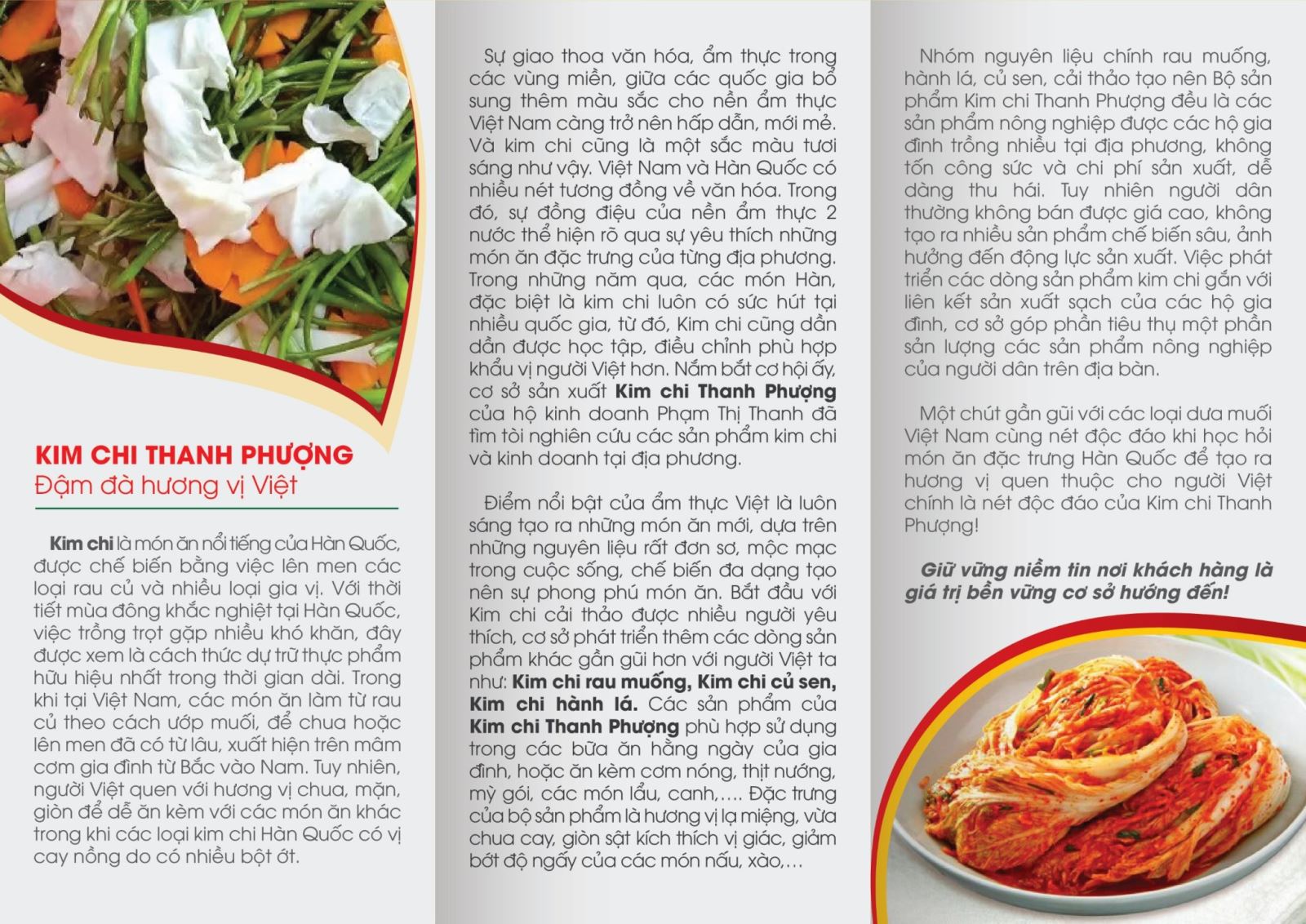 Vừa thân quen với dòng “dưa muối” Việt Nam, vừa học hỏi nền ẩm thực địa phương khác, Kim chi Thanh Phượng mong muốn tạo ra những giá trị mới từ những nguyên liệu bình dị, quen thuộc; học hỏi các giá trị văn hóa truyền thống, tạo ra sự độc đáo riêng trong từng sản phẩm. Hành trình của chúng tôi hy vọng nhận được sự quan tâm, đồng hành để tạo nên những bữa ăn ngon của Quý khách hàng.