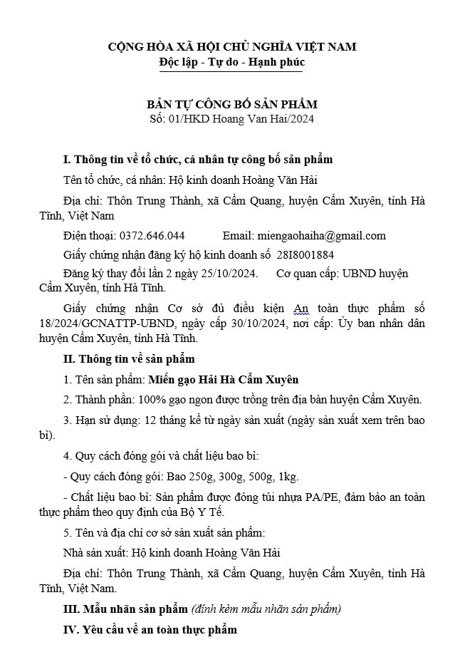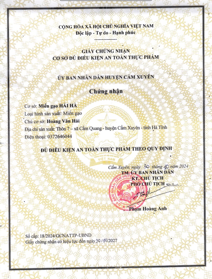 - Tên sản phẩm: Miến gạo Hải Hà Cẩm Xuyên - (Cá thể: )
