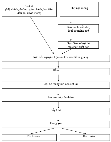 Nguyên liệu đầu vào được lấy từ lò mổ đã được kiểm dịch, Thịt được chọn miếng nạc ngon nhất, từ thịt nạc mông và nạc thăn, về cắt tách ra từng khố rửa sạch, cho vào Ướp cùng gia vị và nước mắm cốt vừa đủ, sau đó được rim lên ngấm vàng ươm theo kiểu thịt kho tàu. Vớt ra tách bỏ hết các màng mỡ còn bám sót lại, Cho vào máy hỗ trợ đánh tơi, Rang vàng tự nhiên qua bếp lửa theo truyền thống, Cam kết không phẩm màu, không phụ za, không chất bảo quản.