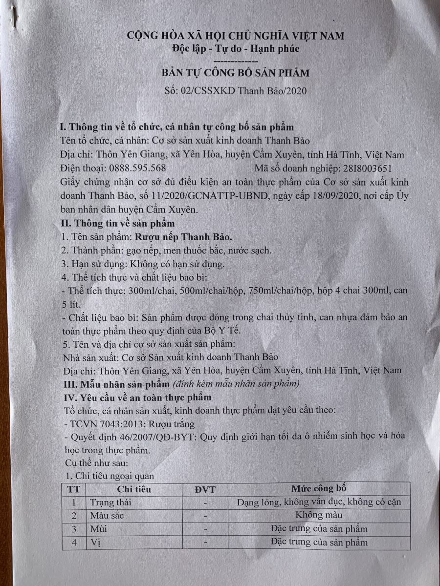 - Tên sản phẩm: Rượu nếp Thanh Bảo - (Cá thể: )