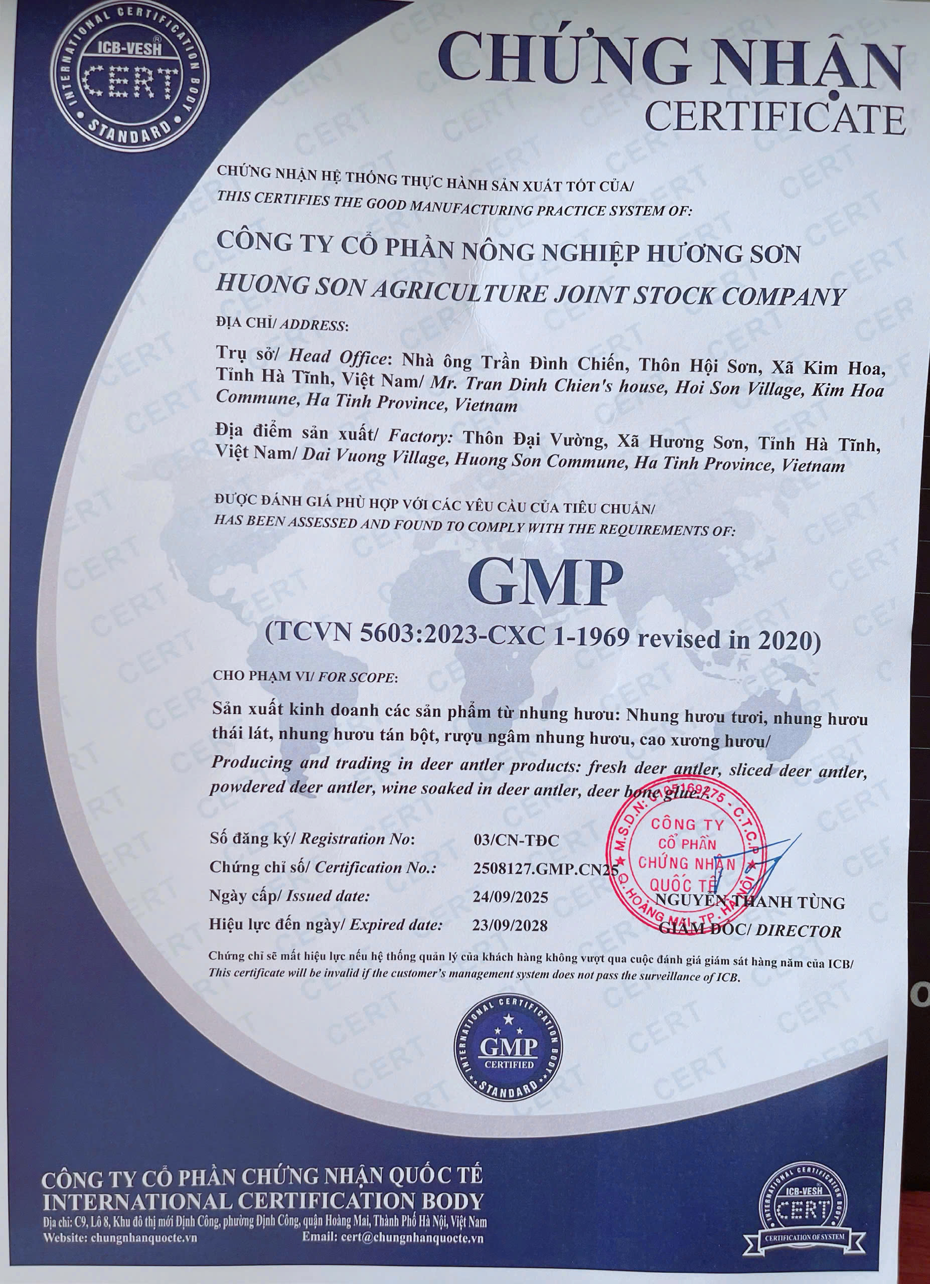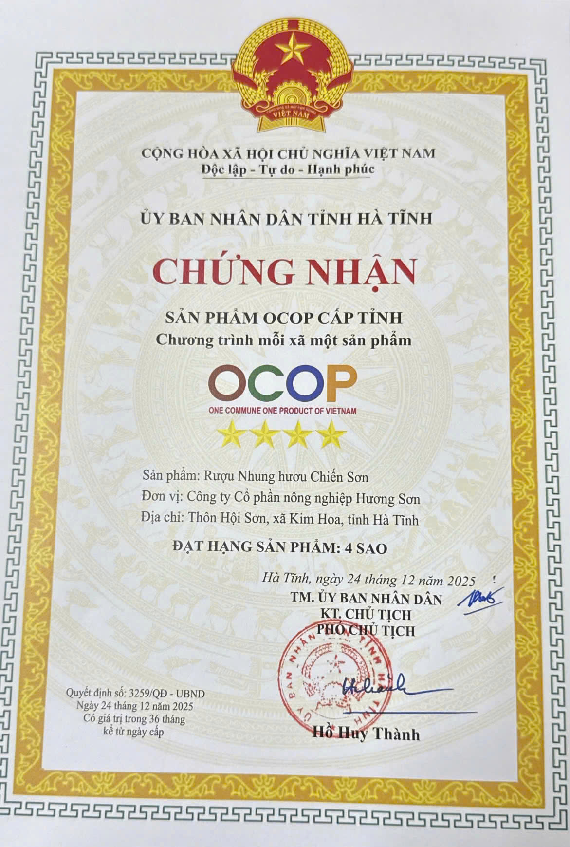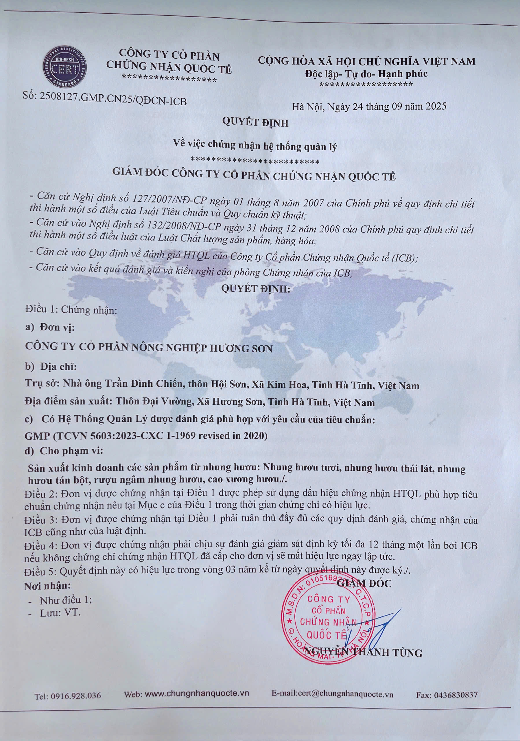 Giấy chứng nhận cơ sở đủ điều kiện an toàn thực phẩm củaCông ty Cổ phần Nông nghiệp Hương Sơn, số 43/2019/NNPTNT-039, ngày cấp 26/11/2019, nơi cấp Chi cục Quản lý chất lượng nông, lâm sản và thủy sản Hà Tĩnh.